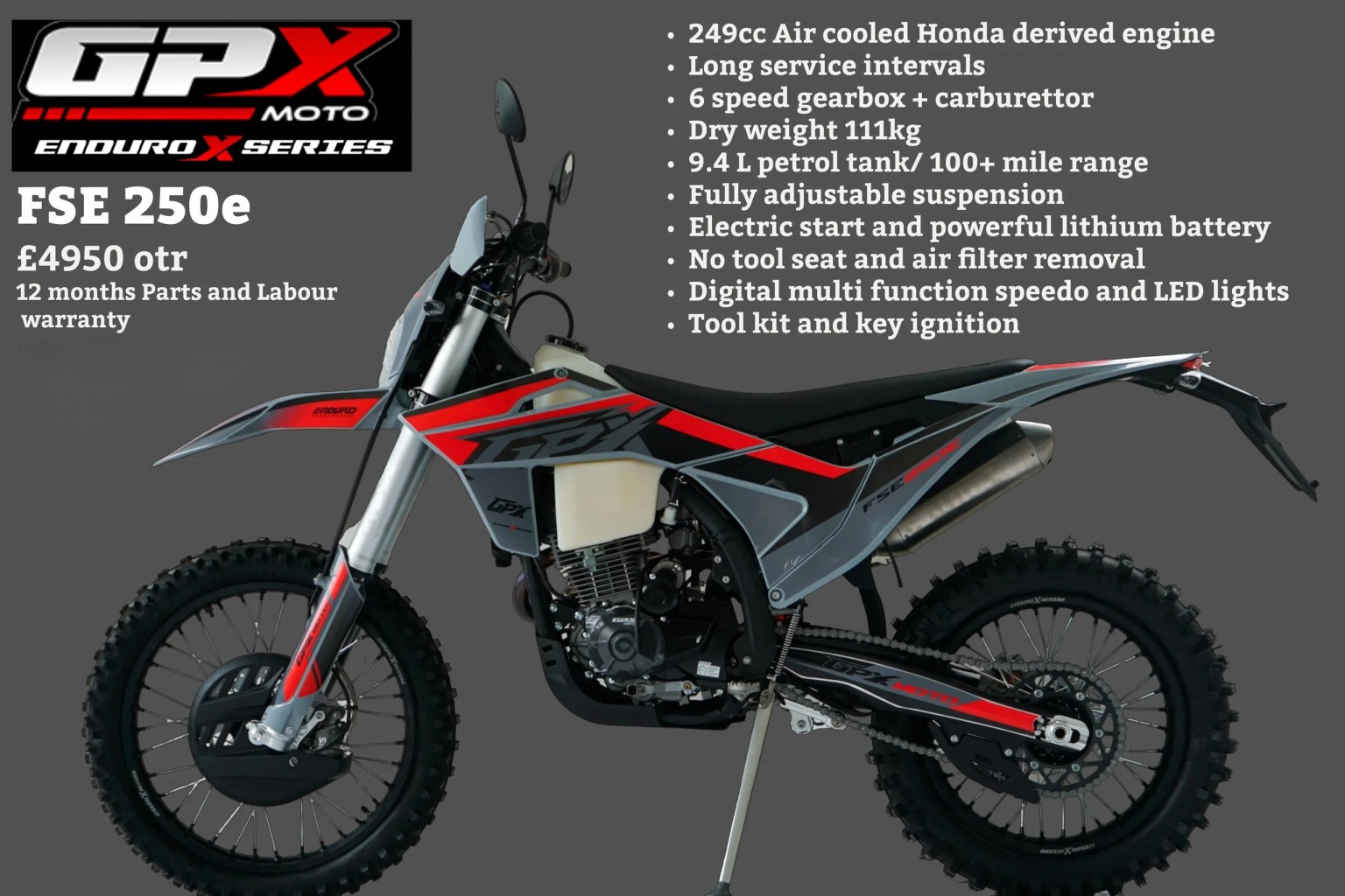 2026 GPX FSE 250E NOW AVAILABLE! In stock now fully assembled with 12 months parts and labour manufacturer's warranty. The full range of 2026 gpx enduro bikes are available at SOR Motorcycles. These bikes are fantastic rivals to the likes of KTM, Husqvarna and Honda but at a fraction of the price.