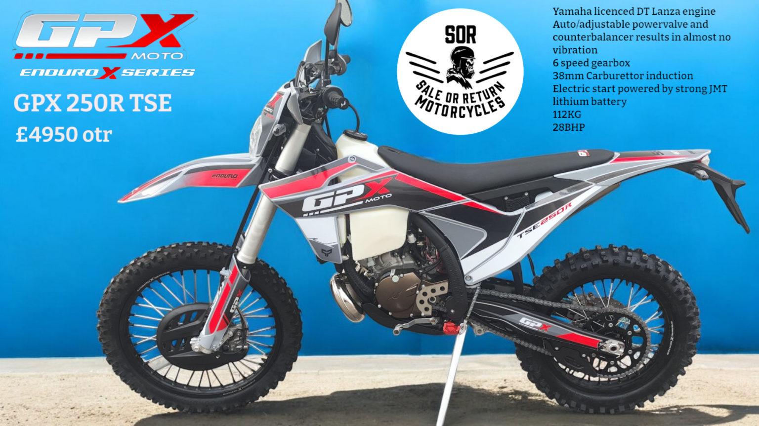 2026 GPX 250R TSE 2 Stroke! Fully assembled with 12 months parts and labour manufacturer's warranty. The full range of 2026 GPX enduro bikes are available at SOR Motorcycles. These bikes are fantastic rivals to the likes of KTM but at a fraction of the price.