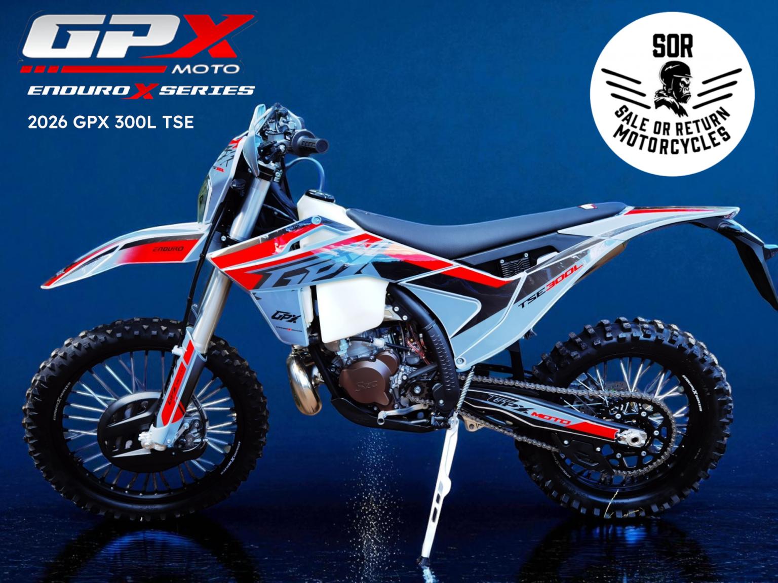 2026 GPX 300L TSE 2 Stroke! Fully assembled with 12 months parts and labour manufacturer's warranty. The full range of 2026 GPX enduro bikes are available at SOR Motorcycles. These bikes are fantastic rivals to the likes of KTM but at a fraction of the price.