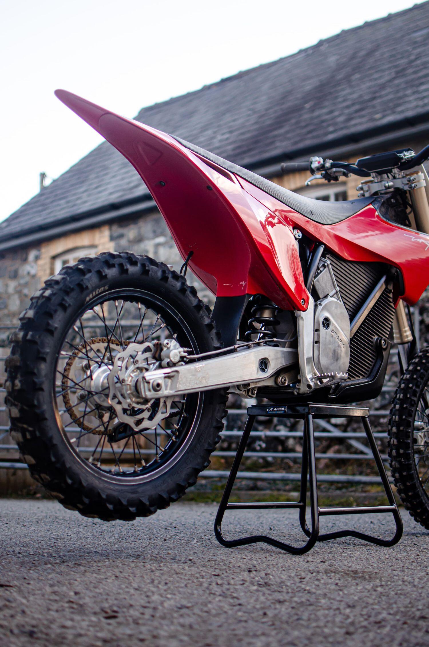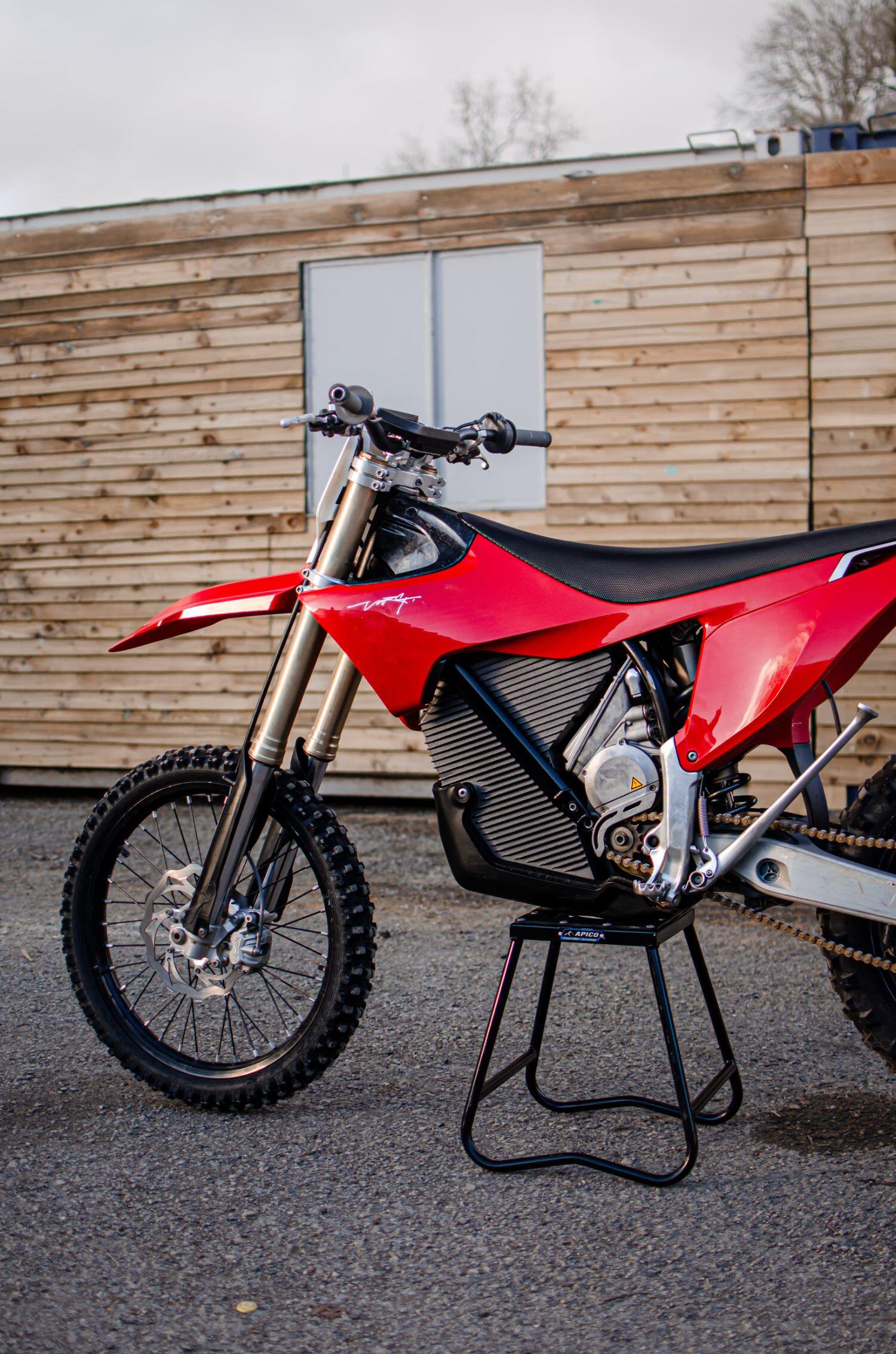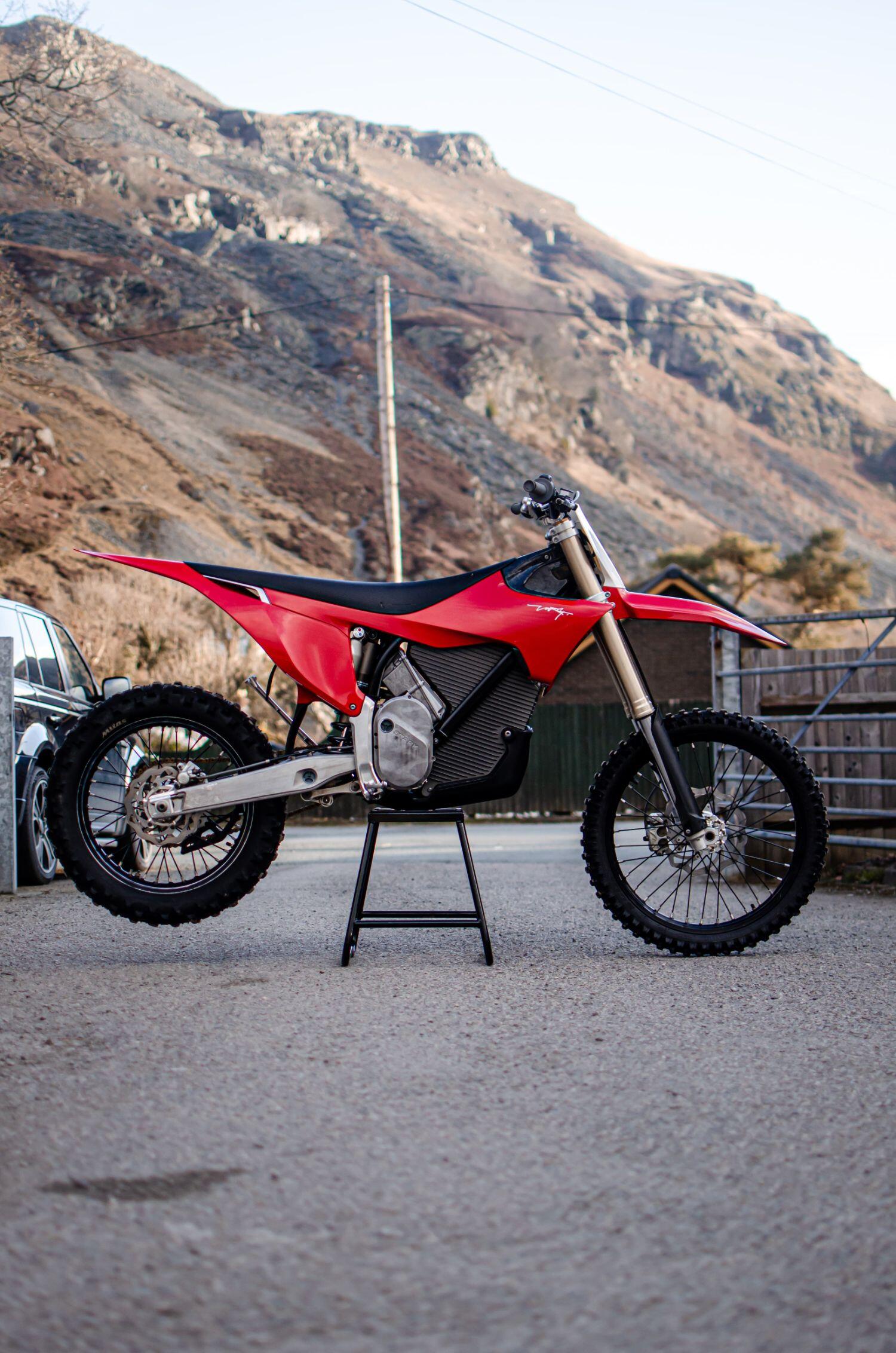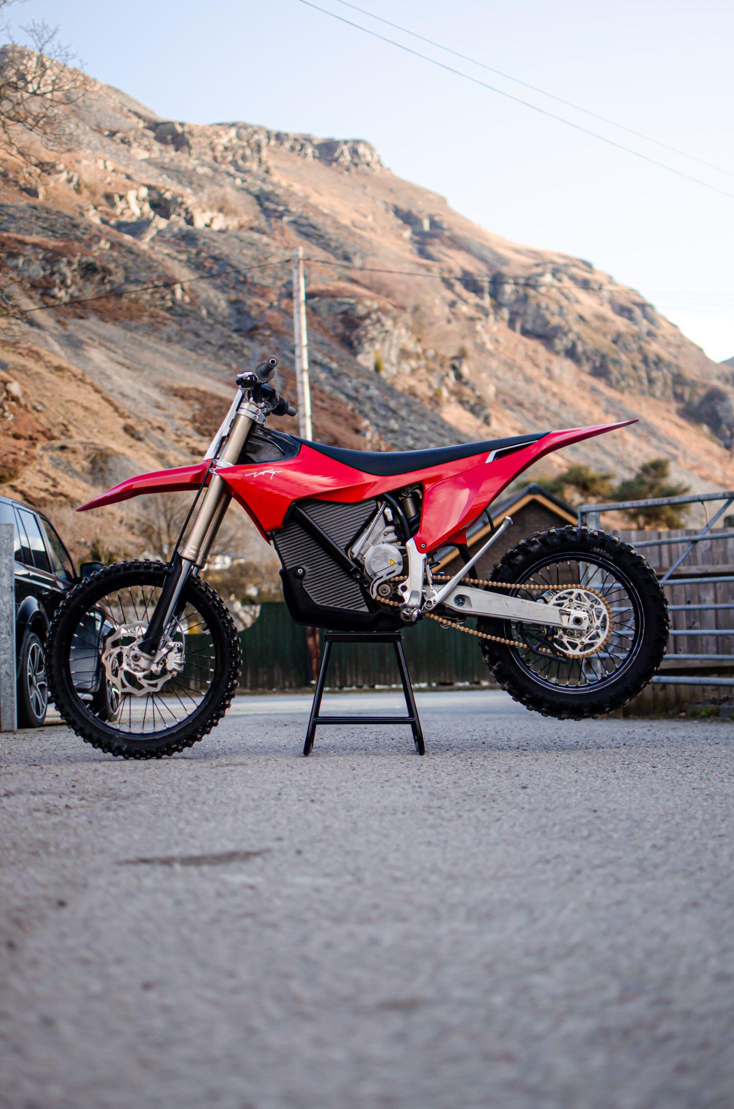 Stark Varg Electric Motocrosser finished in Stark Red, with around 100 hours. This bike has the rear brake operation as a lever on the handle bars. The bike has the side stand optional extra installed.