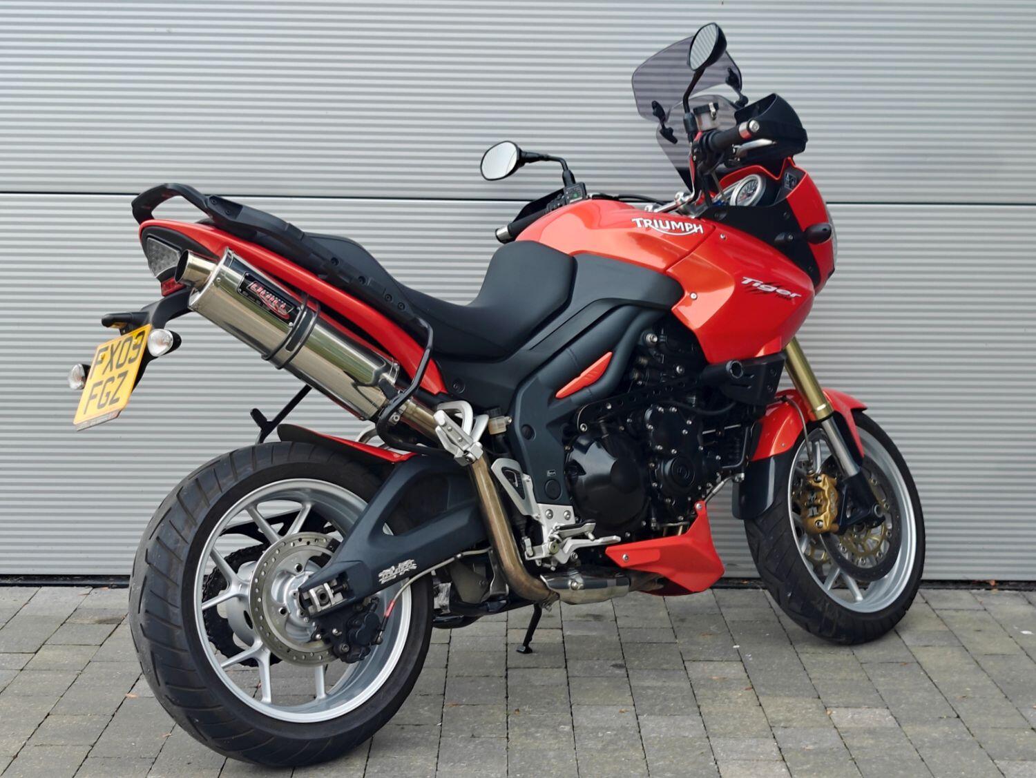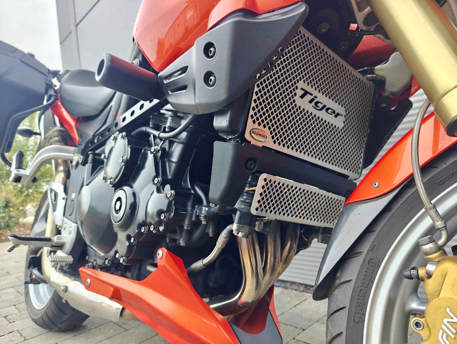 Triumph Tiger 1050 in lovely condition finished in orange with only 14,500 miles. This bike benefits from triumph colour coded panniers, radiator guard, front mudguard extender, heated grips, screen extender, shift indicator, handguards and service history.